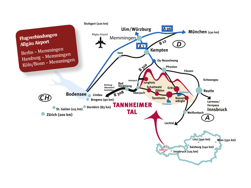 Aus der Schweiz erreicht man das Tannheimer Tal über Lindau - Sonthofen bzw. Arlberg - Landeck - Fernpass - Reutte - Weißenbach > Tannheimer Tal (Keine Vignettenpflicht!)